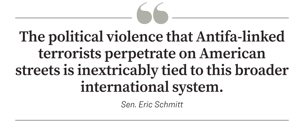 In his Oct. 9 letter to Rubio, Schmitt pointed out that Antifa is “not a collection of independent domestic actors” but an international network.