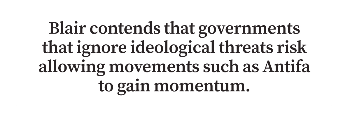 Blair contended that governments that ignore ideological threats risk allowing movements such as Antifa to gain momentum.